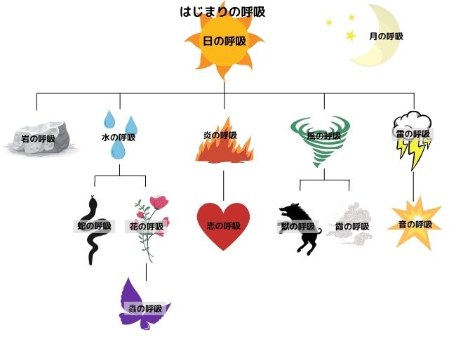 はじまりの呼吸である日の呼吸を元に、 水、炎、風、雷、岩の五大流派が誕生し、さらにオリジナルの呼吸が派生。